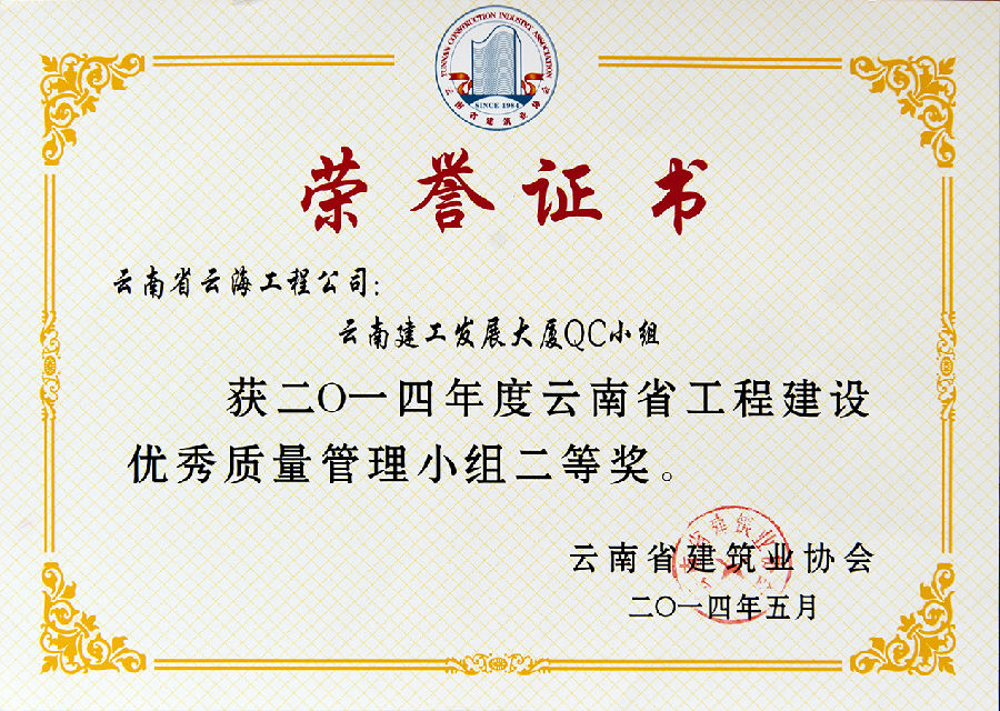 2014年度云南省工程建設(shè)優(yōu)秀質(zhì)量管理小組二等獎(jiǎng)